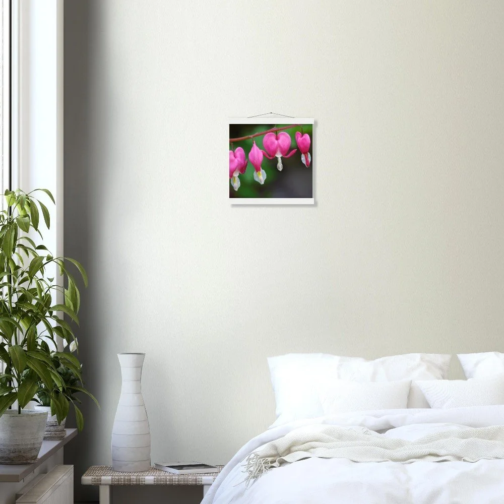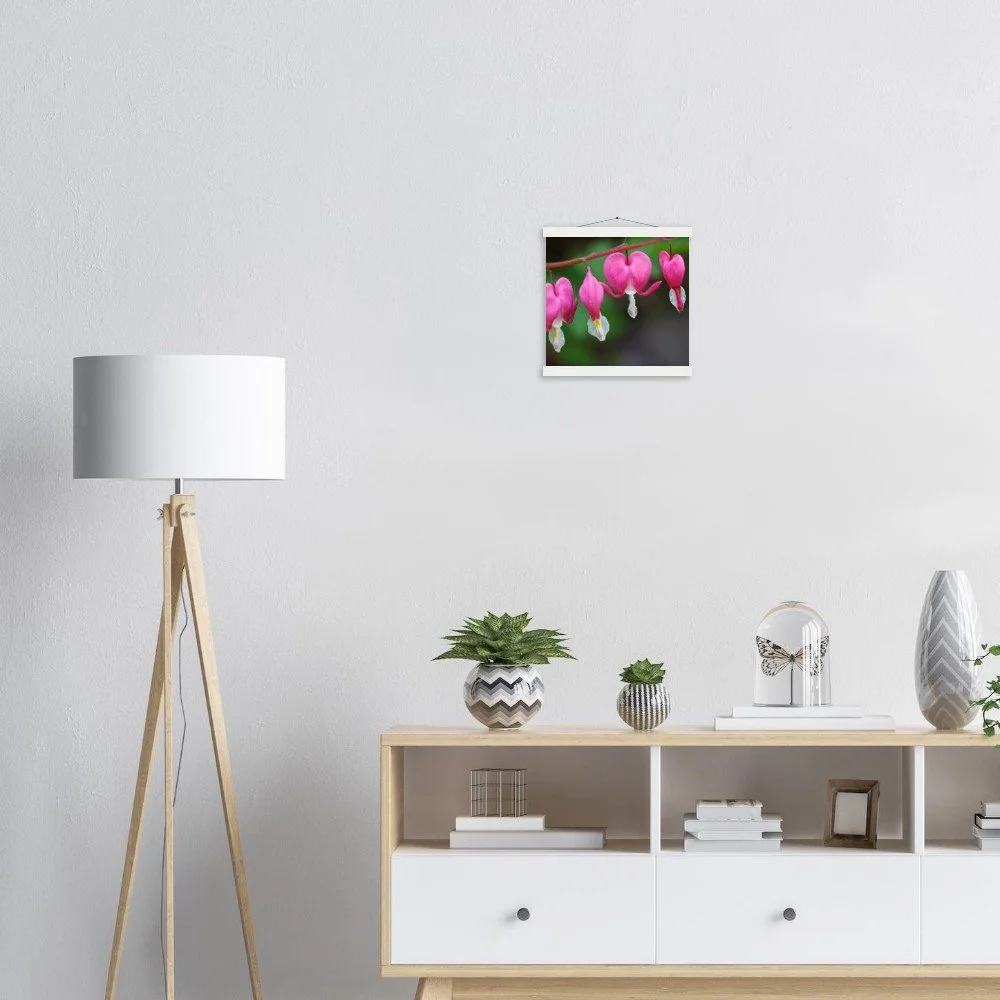Elevate your space with our exquisite Asian Bleeding Hearts poster, featuring a delicate floral design. This stunning print is paired with durable pine wood magnetic hangers that securely hold your artwork without causing damage, allowing for effortless print changes. Printed on premium 170 gsm (65 lb) matte, uncoated paper with a luxurious, smooth finish, this poster offers a sophisticated look and feel. The paper is FSC-certified, ensuring sustainable sourcing for an eco-conscious choice. Available in 29 sizes to perfectly fit any indoor display. No minimum orders required – each piece is printed and shipped on demand, just for you. Discover the beauty of sustainable art for your home or office.